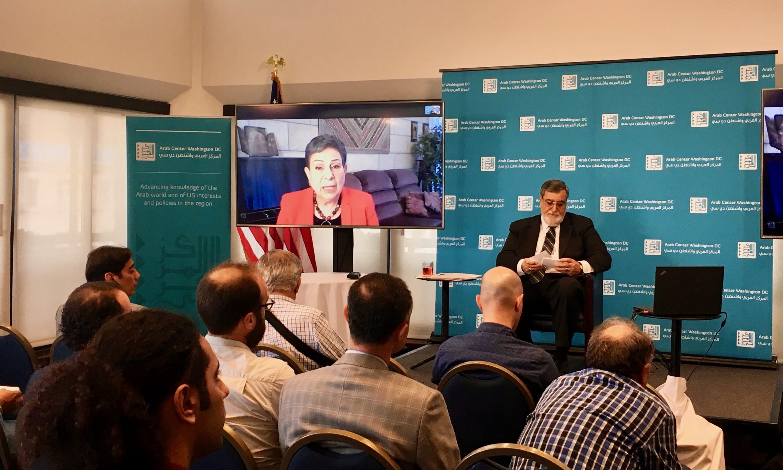 The United States has moved from exhibiting an extreme bias in favor of Israel to being complicit in Israeli crimes and a partner in the occupation, said Hanan Ashrawi Tuesday morning at the Arab Center Conference in Washington, DC. Speaking via video call—after the U.S. denied her visa request—the elected official on the Executive Committee of the Palestine Liberation Association (PLO) discussed the upcoming Bahrain Economic Workshop and Peace Plan, “Peace to Prosperity,” with the executive director of the Arab Center, Khalil E. Jahshan.